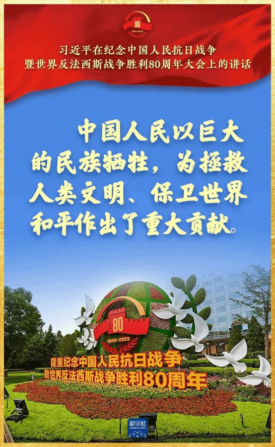 9月3日上午,纪念中国人民抗日战争暨世界反法西斯战争胜利80周年大会在京隆重举行。中共中央总书记、国家主席、中央军委主席习近平发表重要讲话并检阅受阅部队。习近平总书记强调,隆重纪念中国人民抗日战争暨世界反法西斯战争胜利80周年,目的是铭记历史、缅怀先烈、珍爱和平、开创未来。中华民族是不畏强暴、自立自强的伟大民族。中国人民解放军始终是党和人民完全可以信赖的英雄部队。要坚定不移走中国特色社会主义道路,传承和弘扬伟大抗战精神,踔厉奋发、勇毅前行。中华民族伟大复兴势不可挡!人类和平与发展的崇高事业必将胜利!