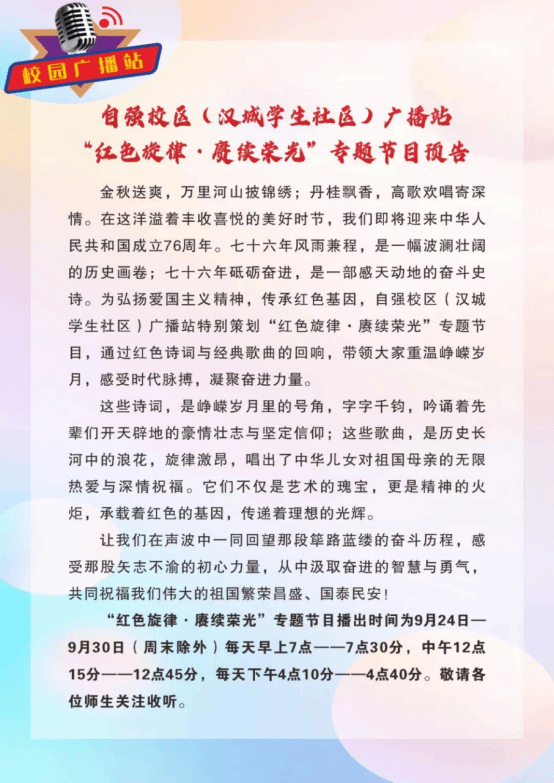 9月24日)正式开启试运行。试运行期间特别策划“红色旋律 赓续荣光"专题节目。敬请各位师生关注收听!