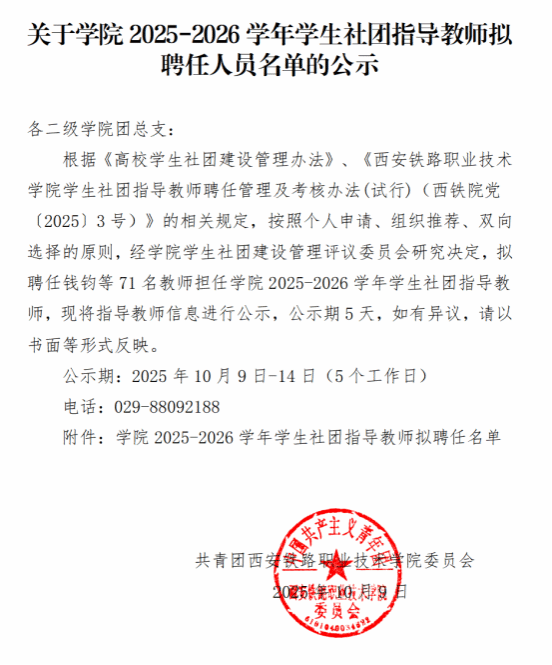 关于学院2025-2026学年学生社团指导教师拟聘任人员名单的公示
