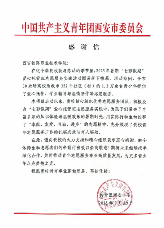 2025年暑期“七彩假期”爱心托管班志愿服务实践活动中被团市委授予“特别支持单位”荣誉称号,同时团市委发来感谢信,对我院共青团组织动员青年投身“七彩假期”爱心托管班志愿服务工作给予高度肯定。
