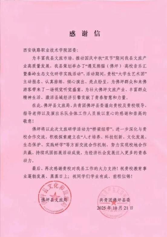 近日,学院收到了来自佛坪县文旅局、共青团佛坪县委的感谢信。信中,佛坪县对我院大学生艺术团在国庆期间参与当地