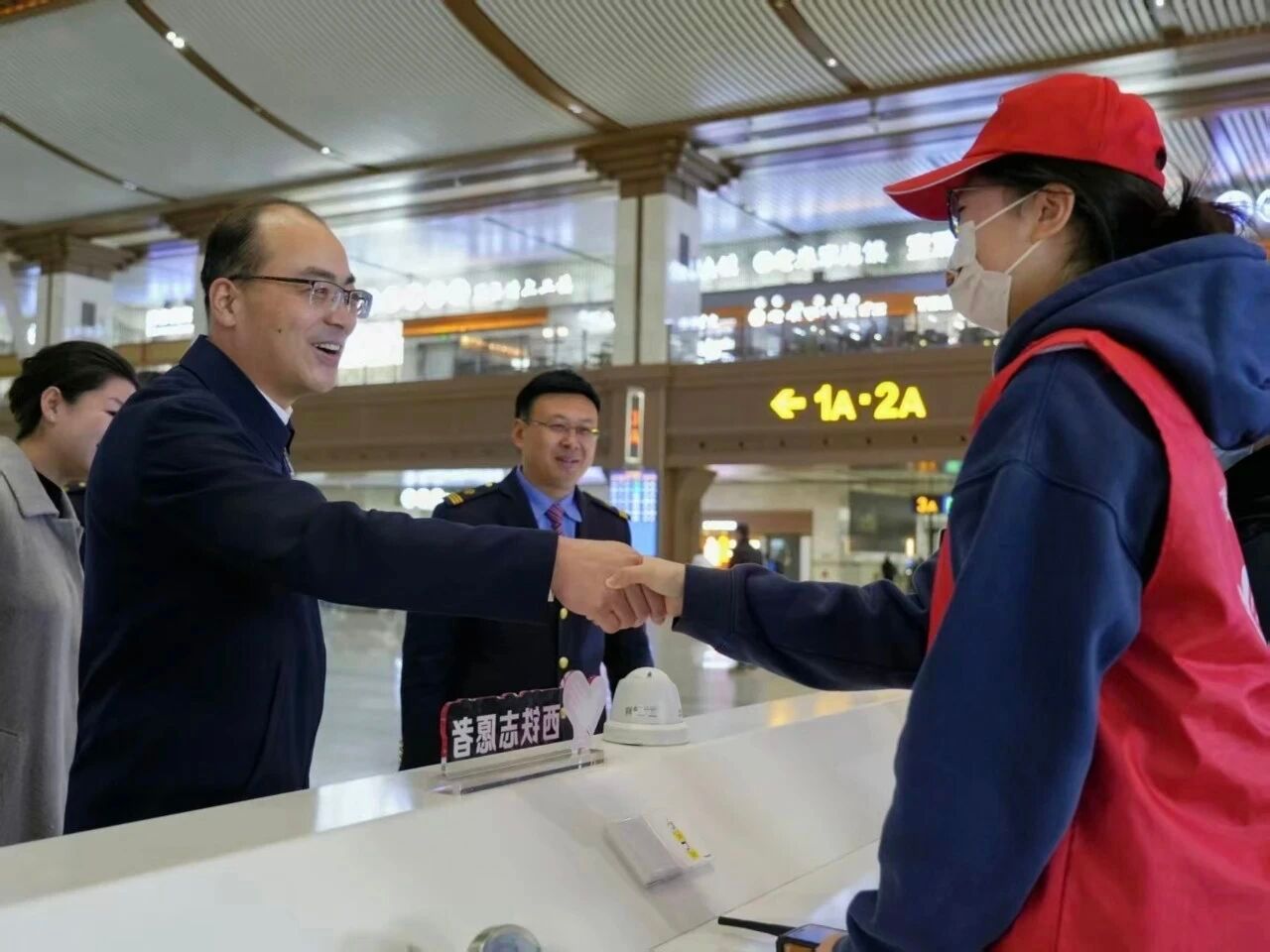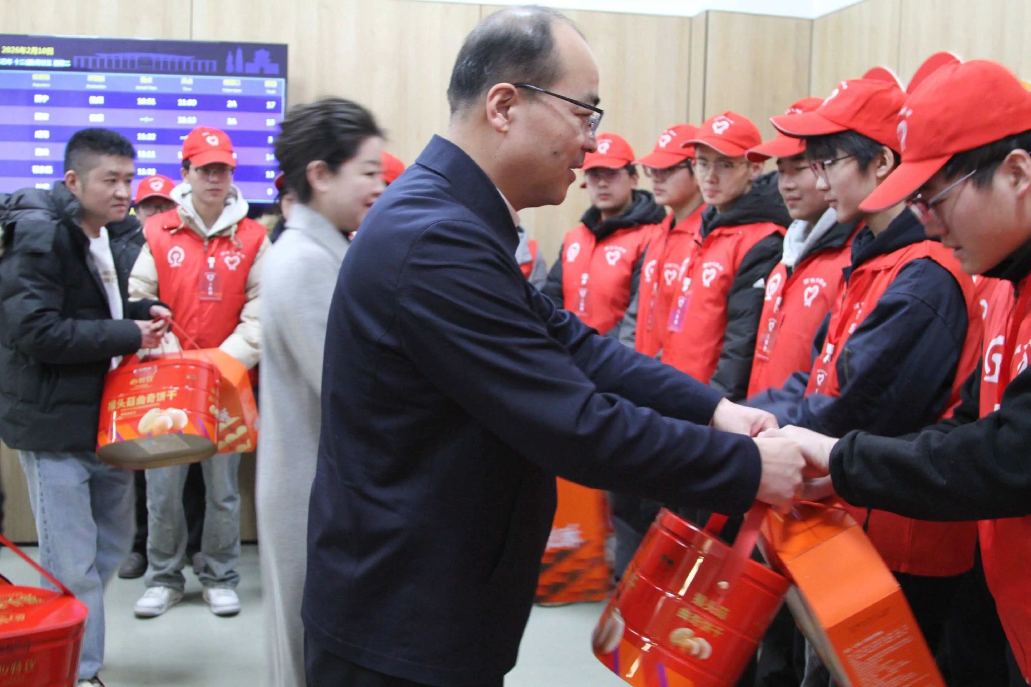 徐永胜书记实地了解志愿者的岗位职责与工作内容,认真倾听同学们在服务过程中的体会与收获,并代表团省委向他们致以诚挚的新春问候。随后,他与车站负责同志一同为志愿者送上节日慰问品,对大家在春运一线展现出的奉献精神和积极风貌给予充分肯定,并亲切叮嘱志愿者们注意保暖与安全。