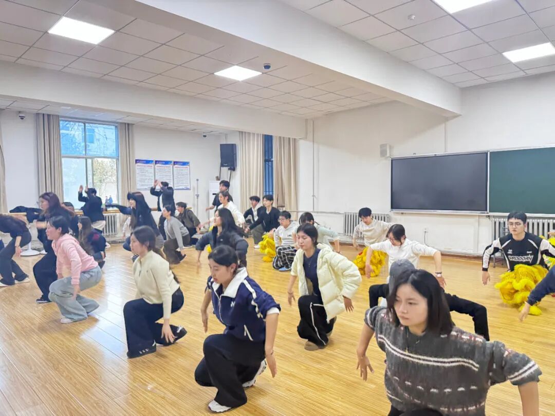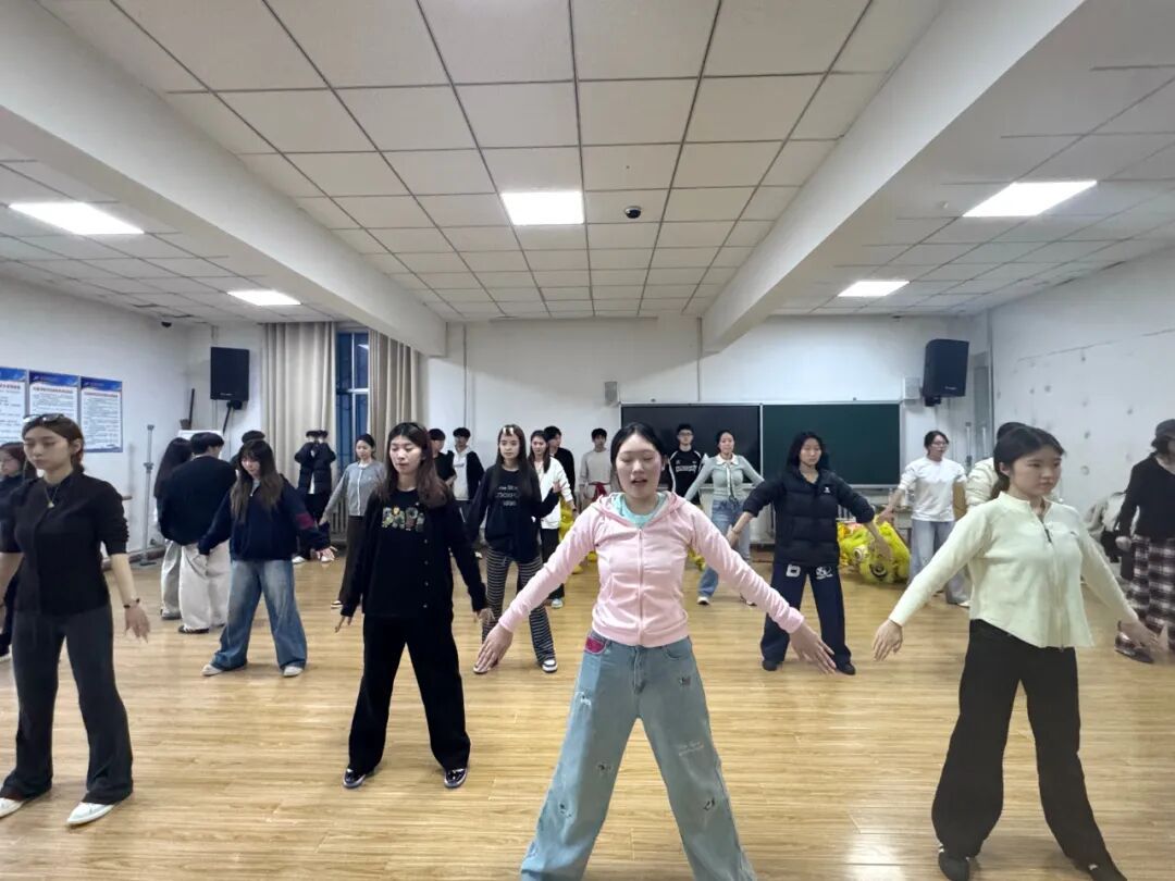 日常训练之余,形韵社还会开展各类特色活动,动作接龙闯关便是其中之一。这项活动以即兴接力为亮点,不设彩排、没有脚本,一人起势、众人接续,前一人的动作既是灵感传递,也是对下一人的创意考验。女生们姿态舒展,动作流畅,尽显青春柔美朝气;男生们则将接力变成体力与力量的展现,俯卧撑、爆发力动作轮番上阵,少年意气十足。这场特色活动不仅让大家在互动中放松身心,更凝聚起社团的温暖氛围,让“以舞相聚、以爱同行”的理念,在一次次动作接力中悄然传递。