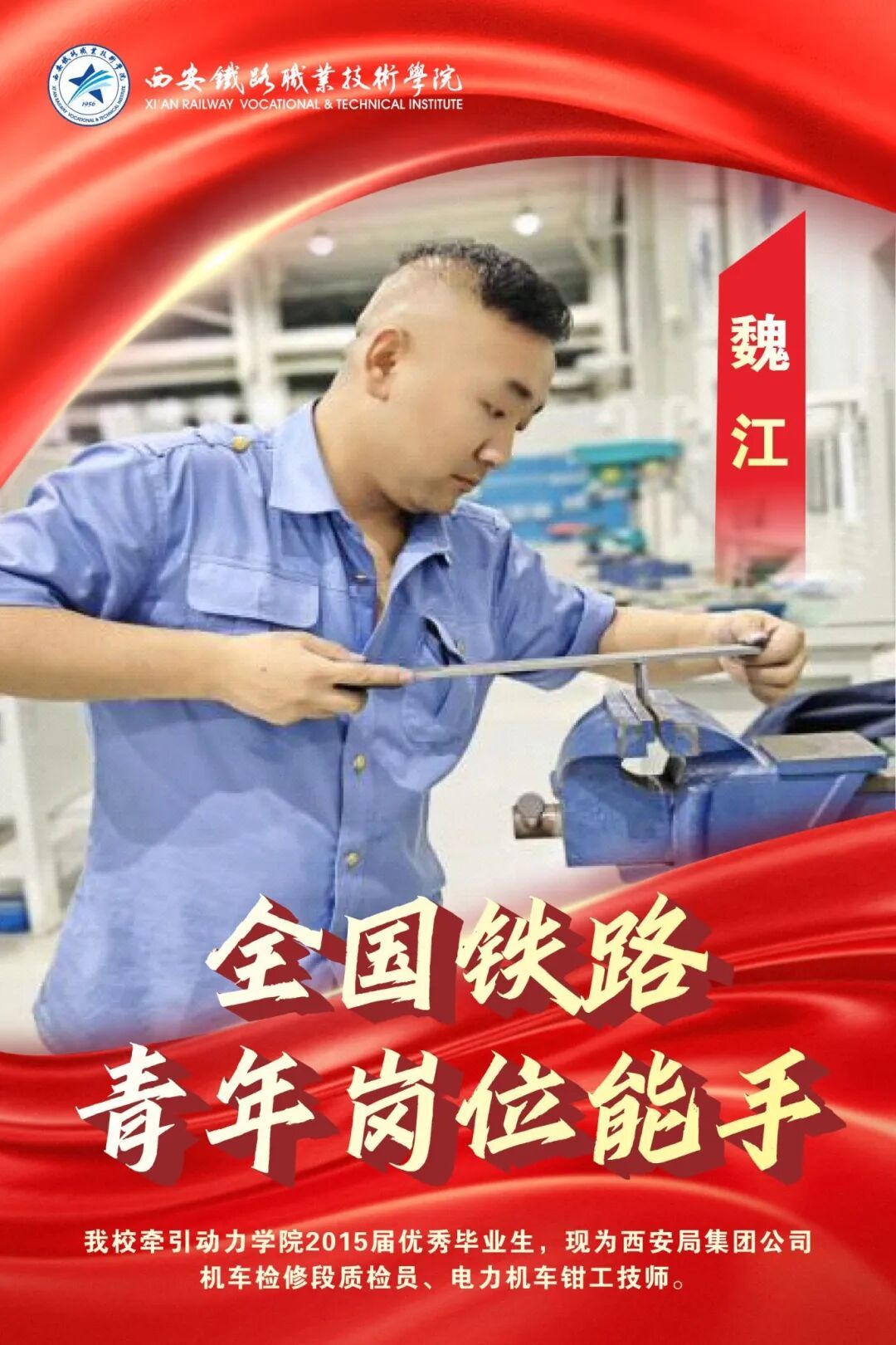 魏江,牵引动力学院2015届毕业生,现为西安局集团公司机车检修段质检员、电力机车钳工技师。他作为一名铁路青年团干部,深耕机车检修一线,设计制作多款工装设备破解生产瓶颈,深度参与技术标准修订与车型自主修攻关;受聘段兼职教师、集团技能鉴定考评员,承担新员工培训、技能比武组织等工作,助力团队技能提升。他以赛促练,多次征战集团、国铁集团技能竞赛,先后斩获国铁集团机车检修工种团体三等奖、电力机车钳工个人第九名,集团公司电力机车钳工技能比武第二名。
