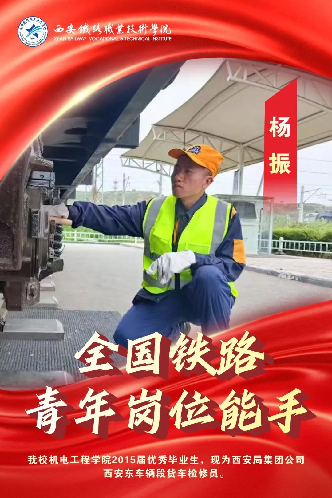 杨振,机电工程学院2015届毕业生,现为西安局集团公司西安东车辆段货车检修员。作为一名一线检车人员,他严于律己,认真执行作业程序,坚持“不少走一步、不漏看一眼、不少敲一锤”,始终将理论与实践相结合,总结工作经验,有效防止车辆事故发生。他刻苦钻研业务,先后于2018年、2019年、2021年被评为西安东车辆段先进个人,2026年荣获全国铁路青年岗位能手称号。在急难险重任务面前,他始终冲锋在前,用一手一锤的坚守诠释责任与奉献。