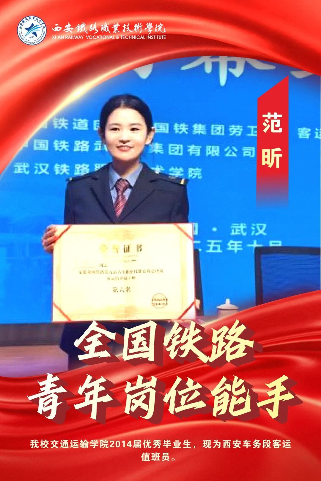 范昕,交通运输学院2014届毕业生,现为西安车务段客运值班员。作为一名客运服务人员,她坚持“安全第一、服务至上”,日常值守中严抓细节管控,提前排查隐患、优化客流疏导方案;主动钻研业务,熟记车次与换乘路线,学习外语与方言,为特殊旅客提供“一对一”帮扶。她深耕规章、反复打磨实操技能,先后斩获西安车务段、西安局集团公司客运值班员技能竞赛第一名,并在全国铁路第九届职业技能竞赛中获第六名,获评全国铁路青年岗位能手,用实干践行铁路人的使命担当。