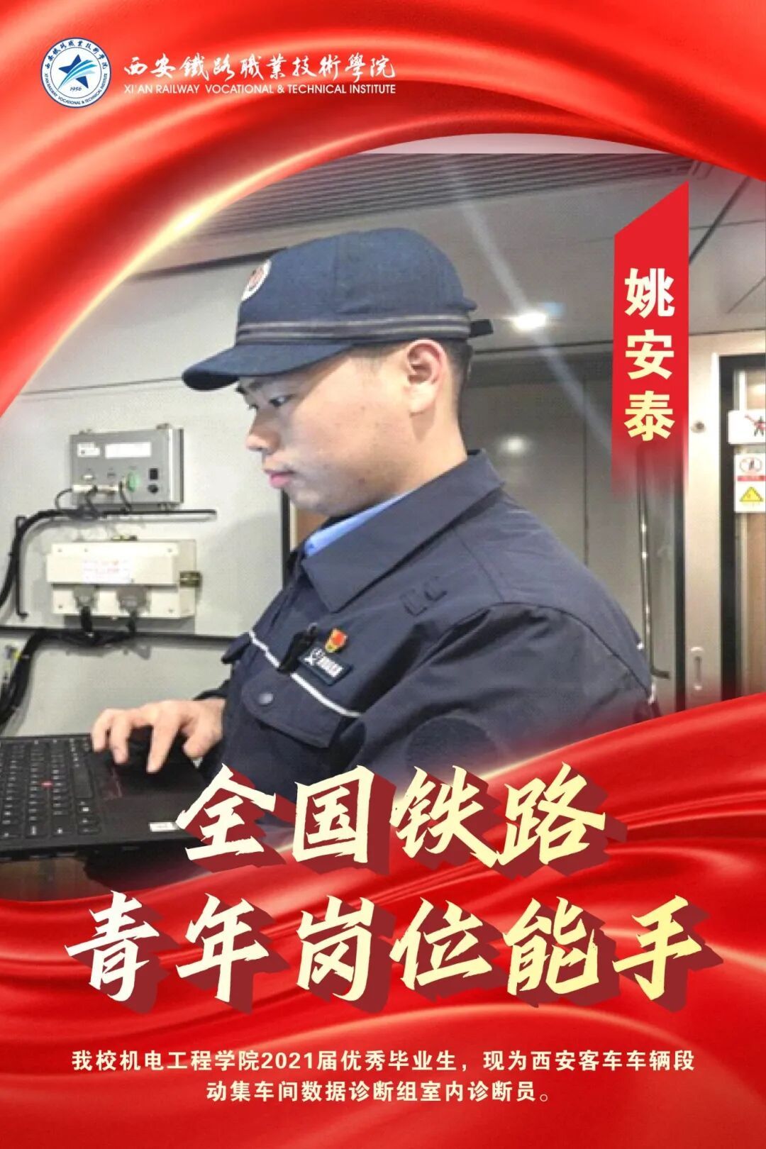 姚安泰,机电工程学院2021届毕业生,中共党员,现为西安客车车辆段动集车间数据诊断组室内诊断员。2023年至2025年负责室内数据分析岗位,先后荣获动集车间动车组机械师第一名、西安客车车辆段第一名、2025年铁路机辆系统客车职业技能竞赛动集地勤机械师第四名、西安局集团公司客车职业技能竞赛动车组机械师第一名。他扎根数据诊断岗位,用精准分析守护动车安全,展现了西铁青年的专业与担当。