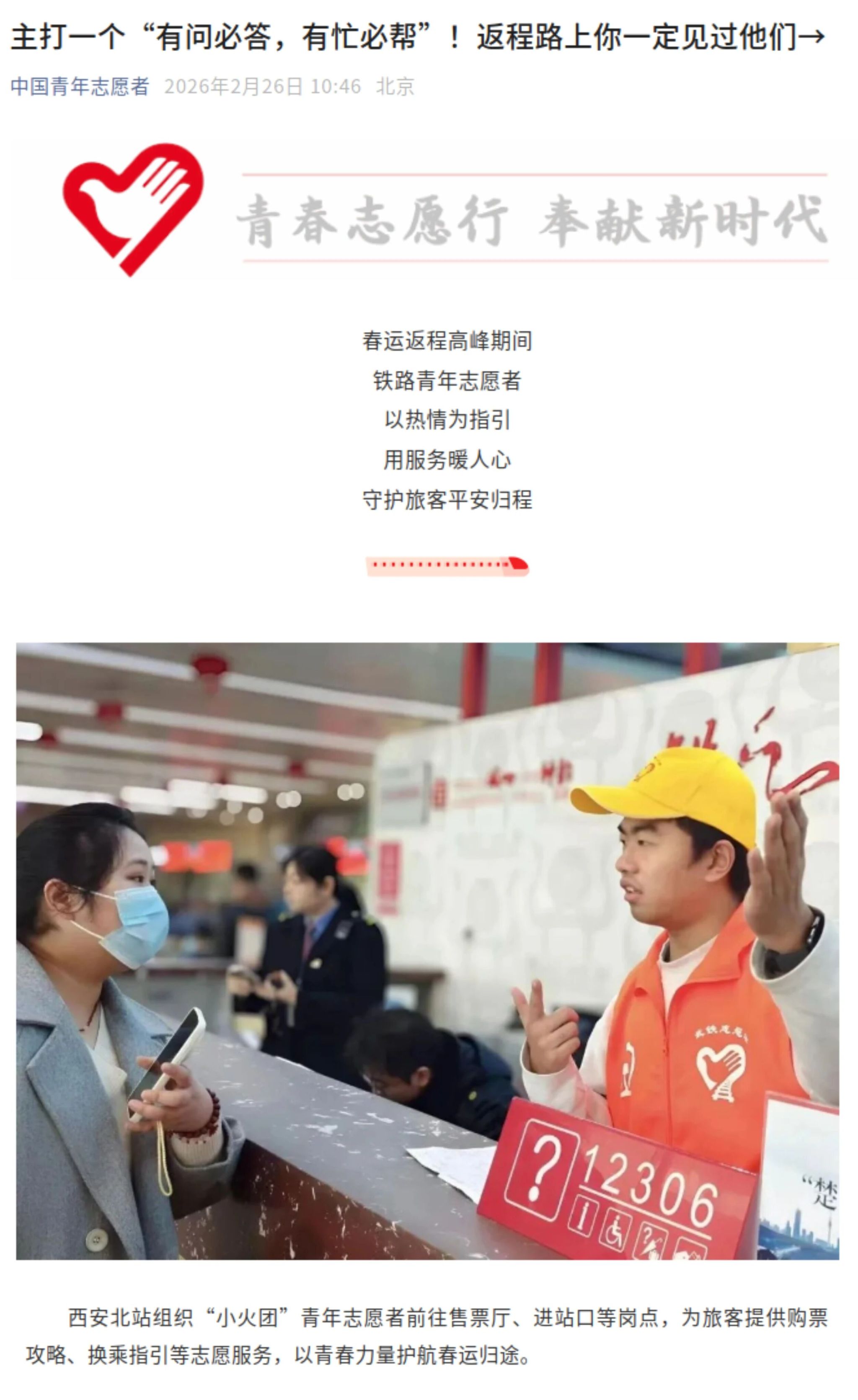 志愿服务期间,志愿者的暖心举动屡获旅客点赞,也吸引了多家媒体关注报道,在社会上引发热烈反响。无论是协助老年旅客提拿行李,还是为带娃家庭开辟绿色通道,西铁院学子用细致入微的服务诠释了“奉献、友爱、互助、进步”的志愿精神,让返乡返岗之路更具温度。
