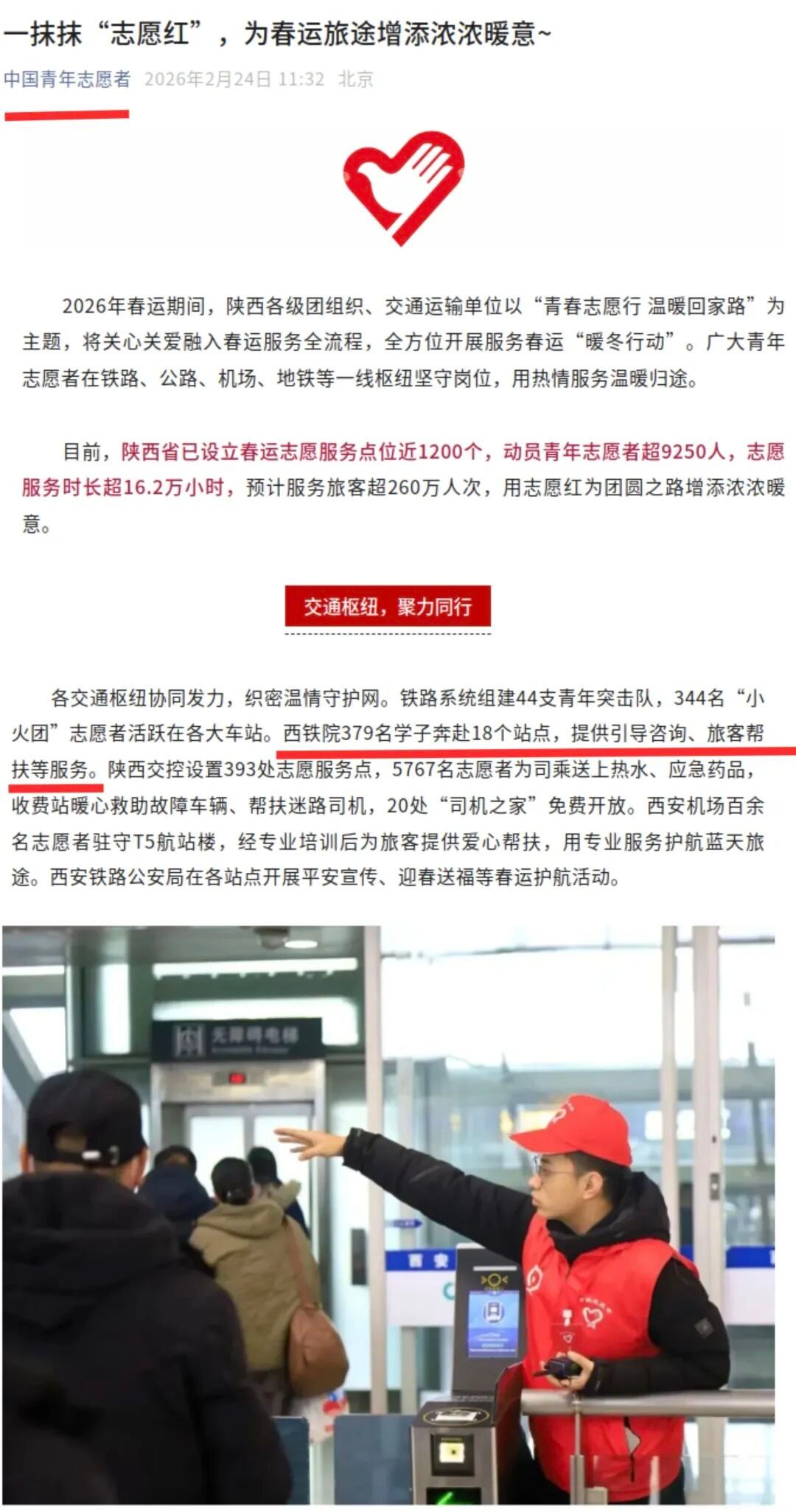 1月31日至3月3日,学院大学生志愿者为期32天的助力铁路2026年春运志愿服务活动落下帷幕。学院379名大学生志愿者怀揣热忱、肩扛使命,分赴中国铁路西安局、兰州局集团有限公司辖内18个车站,以累计约66700小时的暖心服务,为万千旅客的平安归途注入青春力量。从引导咨询到秩序维护,从重点帮扶到应急服务,志愿者们用微笑与坚守,绘就了春运路上最温暖的风景线。