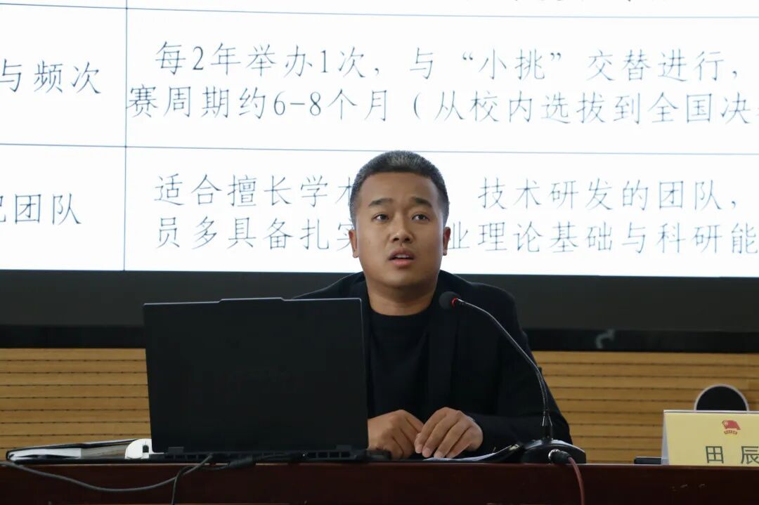 培训会上,团委副书记兼办公室主任田辰围绕五个维度展开系统讲解:一是深入阐释“大挑”“小挑”及国创赛的核心区别与内在联系,从竞赛定位、成果形式到评审侧重逐一厘清,帮助师生明确赛事差异、精准对标参赛;二是系统复盘学院历年获奖作品,通过案例分析总结备赛经验与常见误区;三是重点解读2026年“小挑”改革要点,聚焦赛道调整、评审侧重变化及负面行为清单等核心内容,引导师生第一时间把握竞赛新动向,对标定向精准备赛;四是详细介绍2026年校赛新要求,并结合往年专家打磨经验,凝练形成涵盖项目定位、PPT优化、材料规范、商业模式、知识产权等关键环节的参赛指南;五是明确本届“小挑”完整赛程与关键节点,要求各团队倒排工期,全力以赴做好校赛冲刺准备。